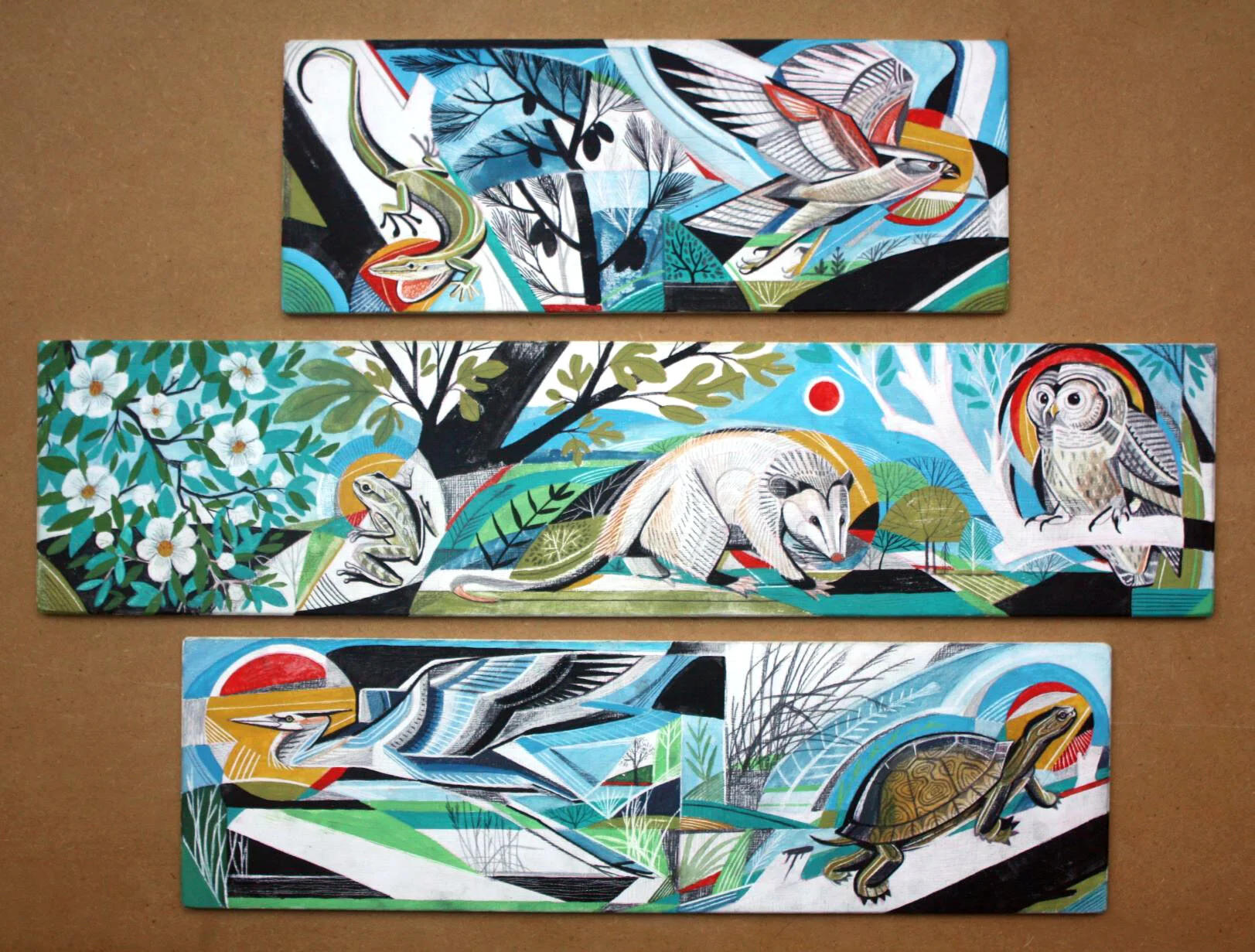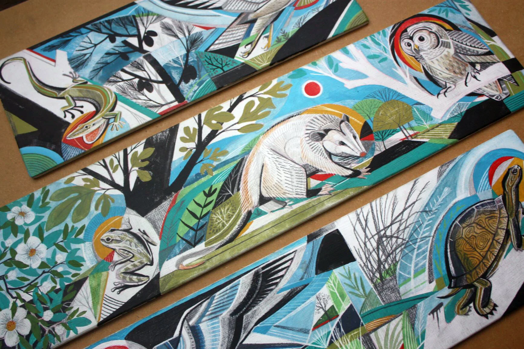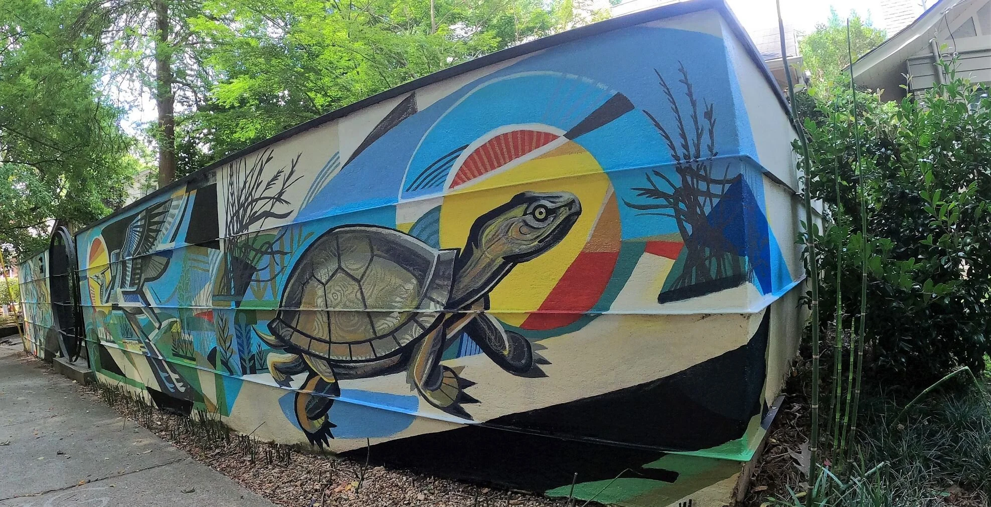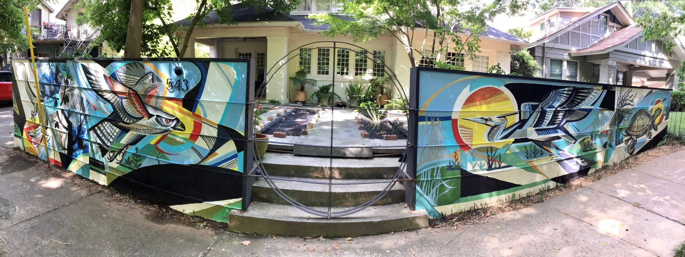 Crow and I created another private commission mural this Summer, this one in Midtown Atlanta right next to Piedmont Park. We had a great week enjoying ATL, the Belt Line, and Piedmont Park. This mural was inspired by plants and animals that live right there on the property and in the park. It is a reminder to appreciate and acknowledge the non-human creatures whom we share space here with here. We created a Walk-Through video of this one for you to get a better feel for where it sits.