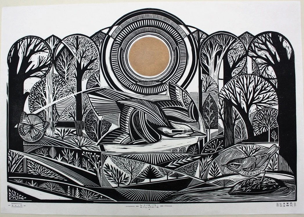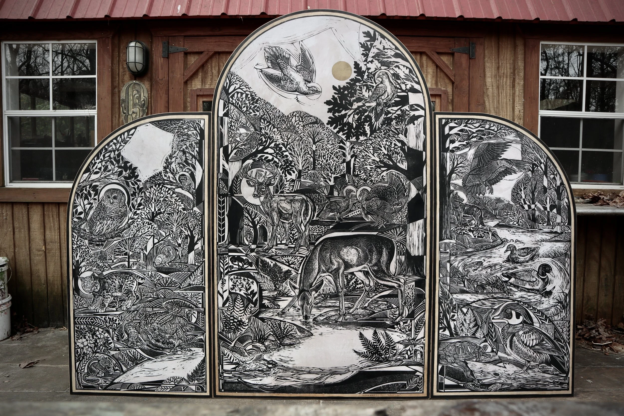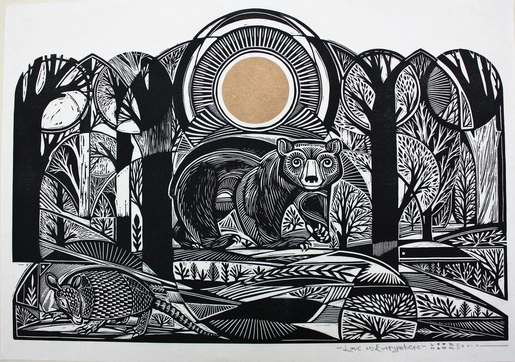Above is an example of a large-scale woodcut print I created a few years ago depicting various inhabitants of the ecosystem surrounding the area where I live in Athens, Georgia. I am beginning a project creating 13 prints in a similar scale and style to document the changing of the landscape and its inhabitants (both flora and fauna) over the course of a year. I will make 12 woodcut images on 18” x 48” panels cut to resemble chapel windows (the title is a reference to the “Stations of The Cross” that were a big influence on me in my Catholic upbringing) and one additional print to represent the sun/moon in honor of the 13-month 28 day calendar. There will be 3 prints representing each season from the month’s observations from March 2026 - February 2027 with a Gallery Show in Athens in the Spring of 2027 releasing the series.